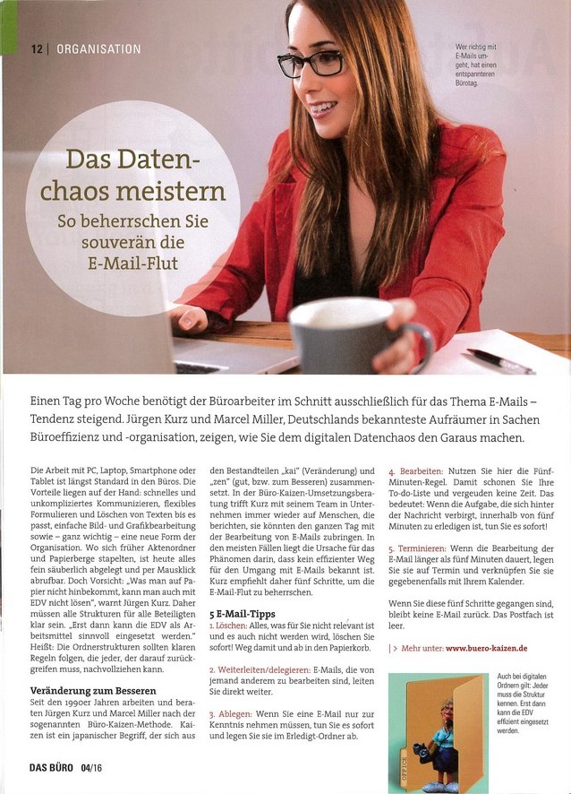 Seit den 1990er Jahren arbeiten und beraten Jürgen Kurz und Marcel Miller nach der sogenannten Büro-Kaizen-Methode. Kaizen ist ein japanischer Begriff, der sich aus den Bestandteilen „kai” (Veränderung) und „zen” (gut bzw. zum Besseren) zusammensetzt. In der Büro-Kaizen-Umsetzungsberatung trifft Kurz mit seinem Team in Unternehmen immer wieder auf Menschen, die berichten, sie könnten den ganzen Tag mit der Bearbeitung von E-Mails verbringen. In den meisten Fällen liegt die Ursache für das Phänomen darin, dass kein effizienter Weg für den Umgang mit E-Mails bekannt ist. Kurz empfiehlt daher fünf Schritte, um die E-Mail-Flut zu beherrschen.