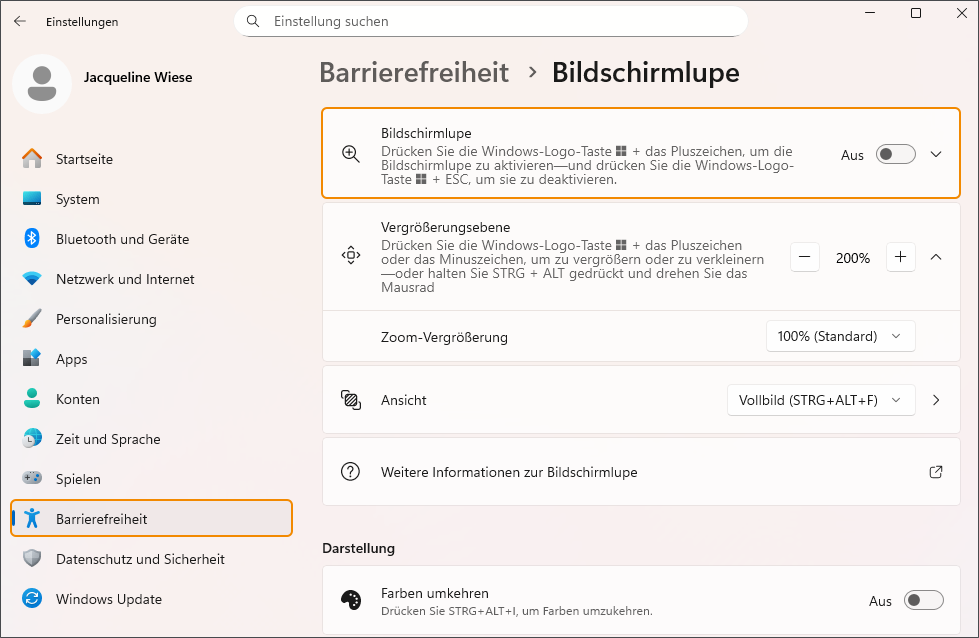 Wussten Sie, dass Windows eine eingebaute Vergrößerungslupe besitzt? Sie ist über die → Einstellungen unter → Barrierefreiheit und → Bildschirmlupe zu erreichen. Haben Sie sie aktiviert, erscheint ein Lupen-Symbol auf dem Monitor. Klicken Sie darauf, um die Darstellung anzupassen:
