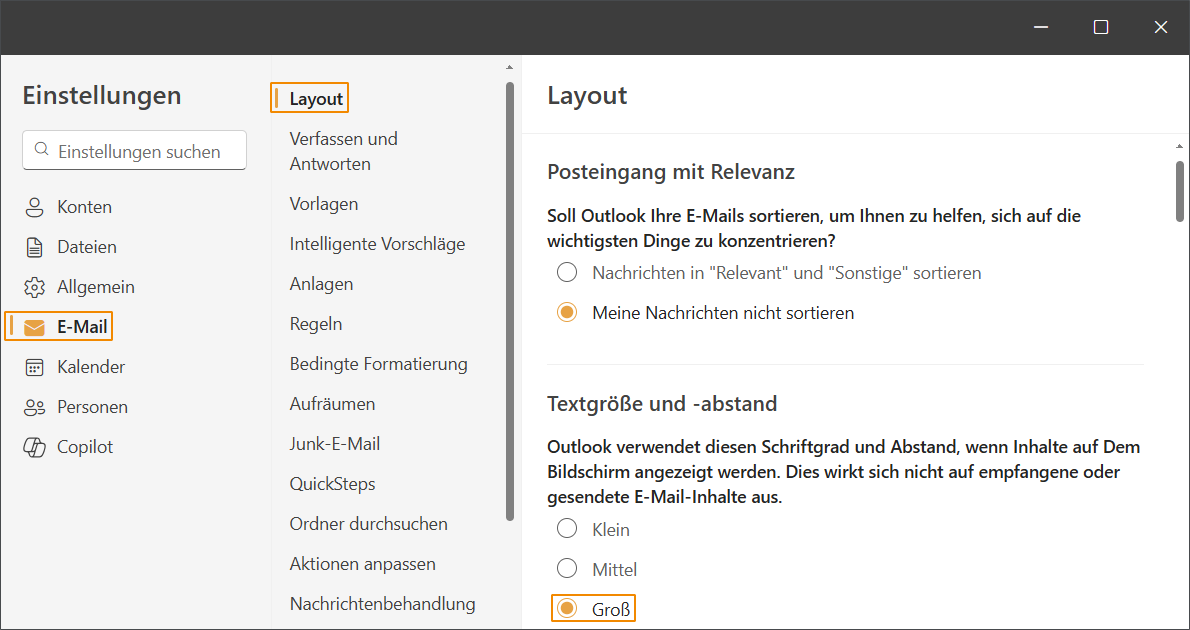 2.1 Textgröße und Abstand im neuen Outlook/Outlook Online vergrößern