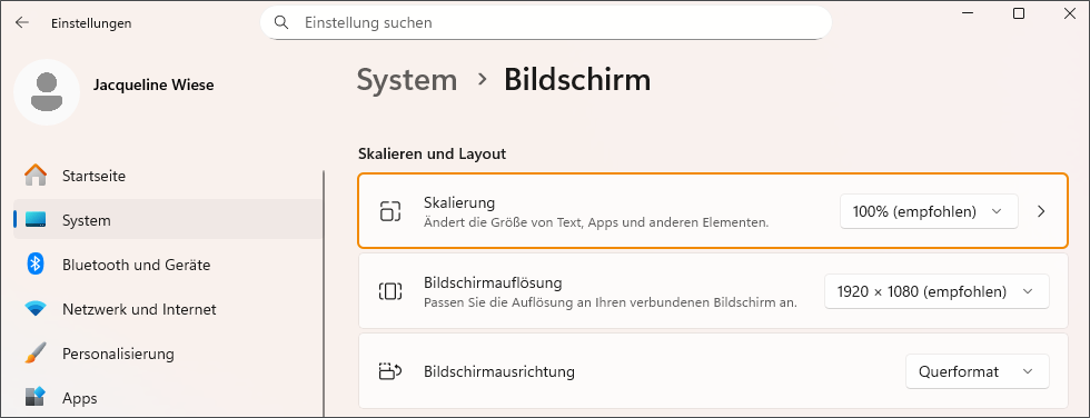 3. Neben → Skalierung sehen Sie den eingestellten Vergrößerungsgrad. Dort kann man ihn auch anpassen.