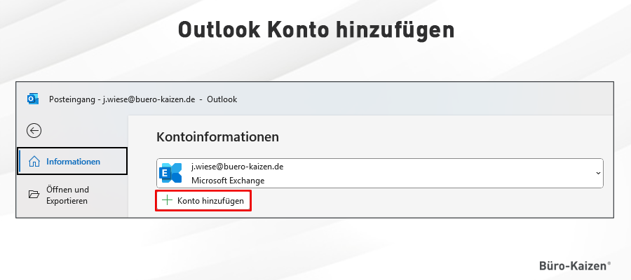Es gibt zwei verschiedene Möglichkeiten, wie man in Outlook ein weiteres E-Mail-Konto hinzufügen kann (z. B. von Exchange, Microsoft 365 oder auch Gmail, Freenet, iCloud oder GMX). Entweder direkt, dann haben Sie in Ihrem Postfach die Gesamtübersicht über alle eingehenden und ausgehenden E-Mails. Oder über ein zusätzliches Nutzerprofil. Das hat den großen Vorteil, dass Sie die verschiedenen E-Mail-Konten dann auch getrennt voneinander in demselben Outlook verwalten können, ohne dafür das Benutzerkonto extra wechseln zu müssen (z. B. berufliche und private Mailkonten oder von zwei verschiedenen Unternehmen). In unserem Büro-Kaizen Blogbeitrag erklären wir Ihnen, wie man ein Outlook Konto hinzufügen kann, mit Schritt-für-Schritt Anleitungen für Windows-PCs und Android-Geräte.