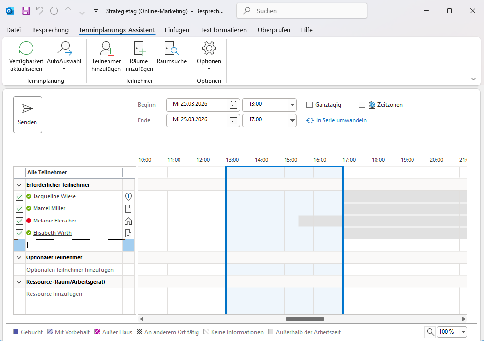Wenn alle Teilnehmer eingestellt worden sind, können Sie anhand der horizontalen Linien erkennen, ob die Empfänger zum gewählten Zeitpunkt des Meetings (blaue Spalte) Zeit haben oder nicht. Sind die horizontalen Streifen hingegen violett eingefärbt oder gepunktet dargestellt, dann ist der entsprechende Kontakt zum Zeitpunkt der Besprechung außer Haus oder an einem anderen Ort tätig. Das ist der enorme Vorteil daran, wenn Sie im Büro Outlook verwenden: Jeder Mitarbeiter trägt seine Termine in Outlook ein und speichert sie dadurch auch auf dem Büroserver – und anderen Nutzern stehen diese Informationen bei der Erstellung von Terminvorschlägen ebenfalls zur Verfügung.